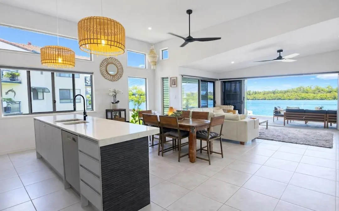 Azurea! Grand 7Br Riverfront Retreat Maroochydore villa ligt op alleen 1 km afstand van de Sunshine Coast en nodigt gasten uit om te ontspannen op een terras.